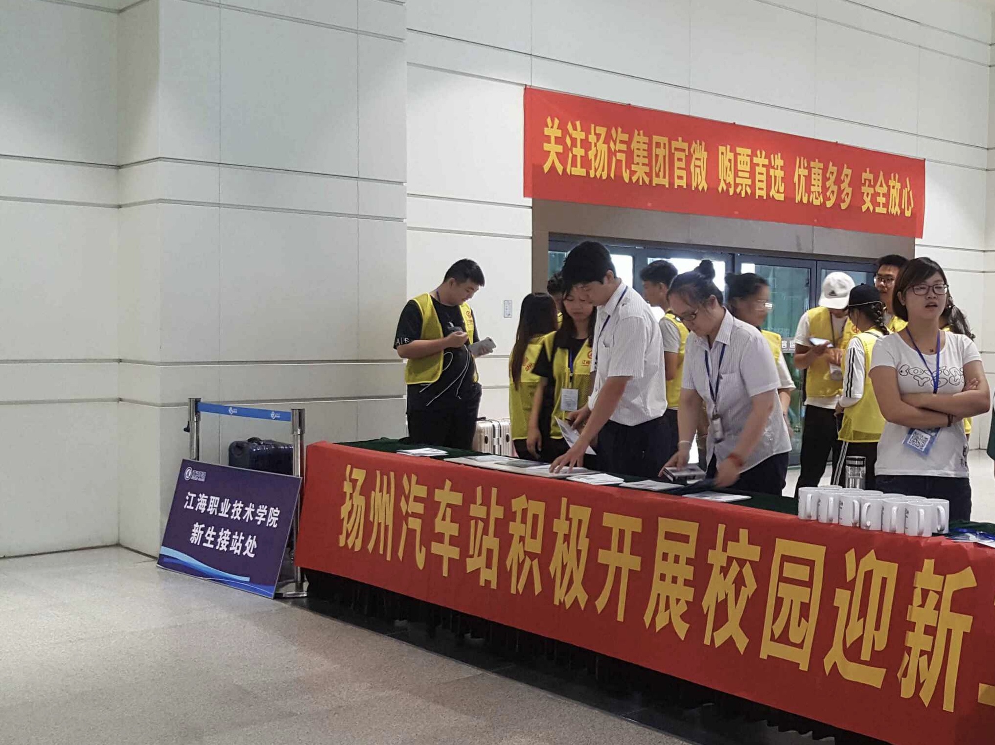 8月31日起,揚州站在換乘大廳設(shè)置校園迎新候乘區(qū),按照各校區(qū)新生入學(xué)時間表組織志愿者在現(xiàn)場開展校園班線問卷調(diào)查、推廣揚汽官微等營銷產(chǎn)品,為集團公司下一步拓展校園市場作好基礎(chǔ)工作。“校園迎新候乘區(qū)”這一舉措也得到了校方的一致好評。