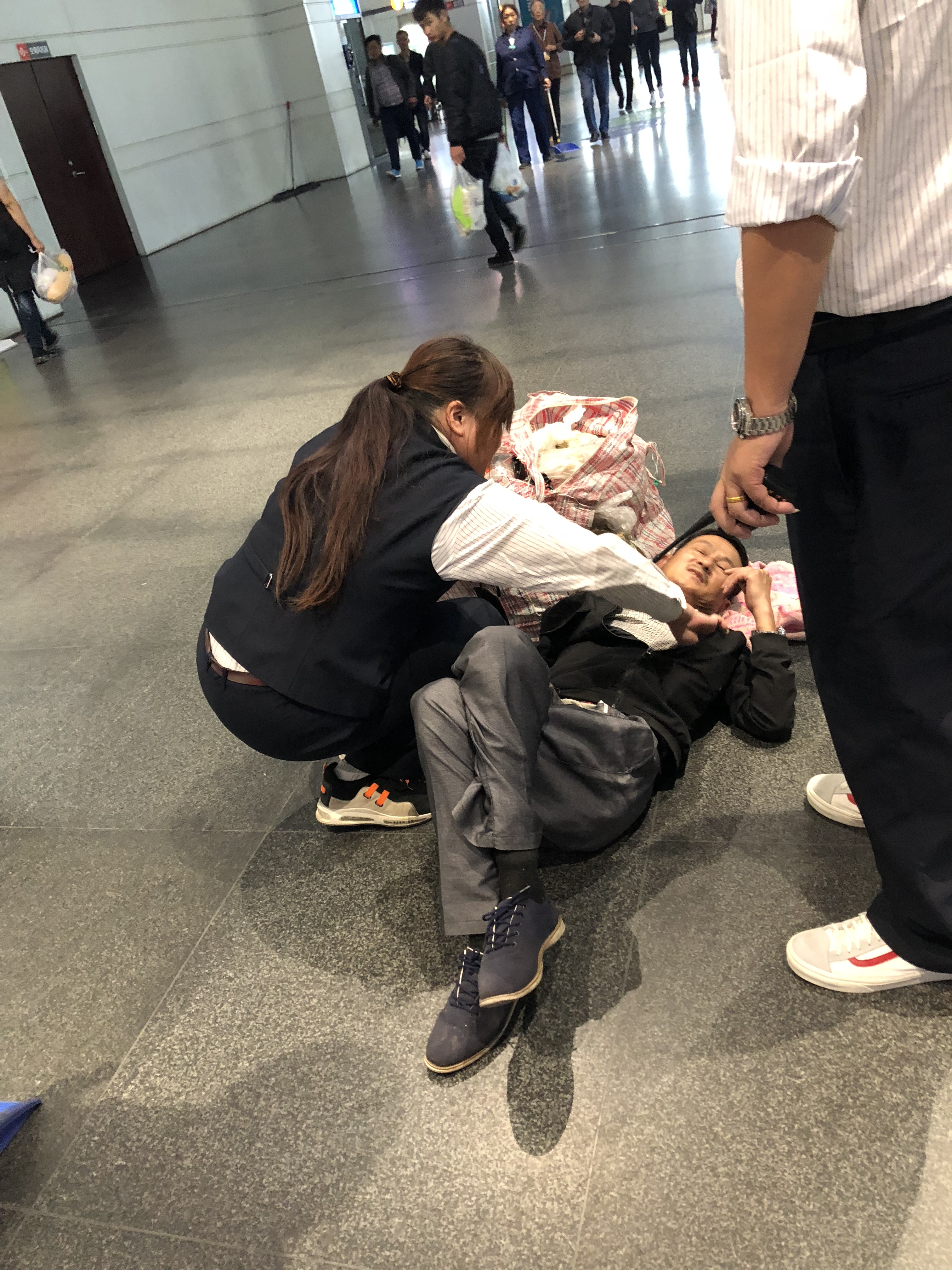 11月3日,來自徐州的張先生注射了胰島素之后沒有及時(shí)就餐,導(dǎo)致低血糖發(fā)生,在揚(yáng)州站的售票廳突然摔倒在地,神情迷糊,難以起身,大小包裹掉落一地。