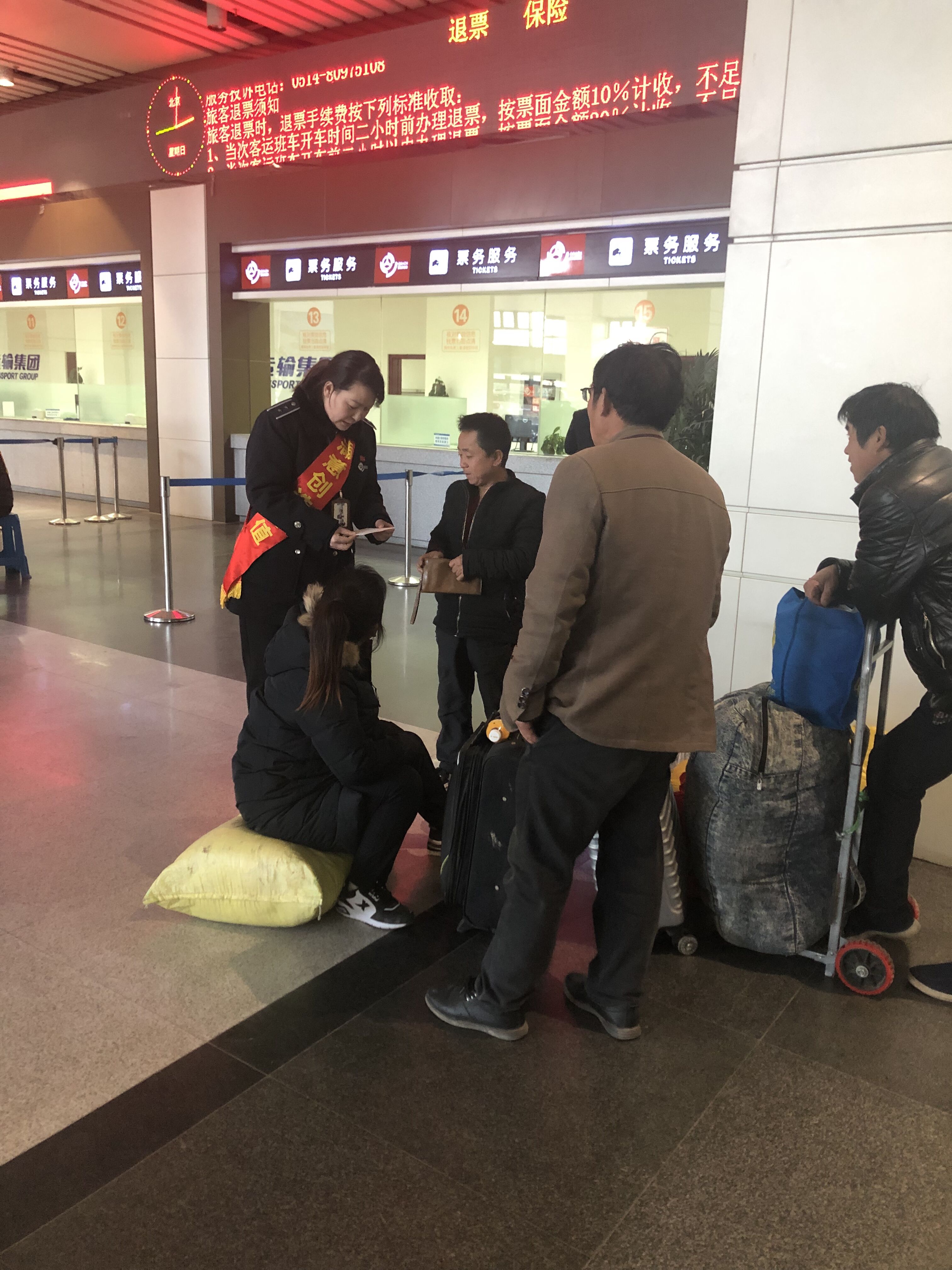 1月27日下午三點(diǎn),服務(wù)班班長(zhǎng)尹海霞在現(xiàn)場(chǎng)巡查時(shí)發(fā)現(xiàn),售票大廳一角有四個(gè)農(nóng)民工模樣的旅客,望著眼前一大堆行李,說(shuō)著外地方言,不停地議論著。