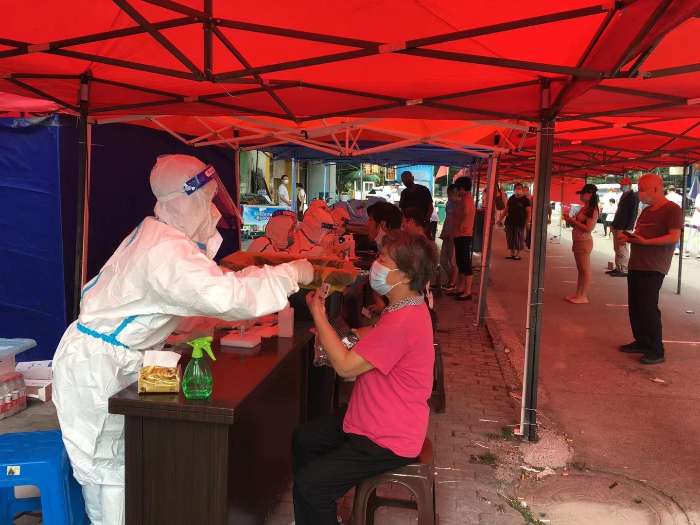 隨著時間的推延,戶外炎熱難耐,不是親身經(jīng)歷,真難以想象沖在第一線的醫(yī)護人員是怎么熬過來的。為時近幾個小時的這段艱難時光中,我好幾次覺得自己快缺氧窒息了,不過看著其他志愿者送來的降溫冰塊,給我們?nèi)韲姙⒕凭禍,誰又何嘗不是負重前行呢?在一次次鼓勵加油中,終于完成了上午的核酸檢測任務(wù),當(dāng)我脫下防護服后,衣服可以擠出水來,雙手被汗?jié)n泡的發(fā)白。同時,排隊做核酸的居民也很辛苦,個個汗流浹背,他們聽從指揮,秩序井然,有的向我們問候,“你們也辛苦了!”,心里很是感動。