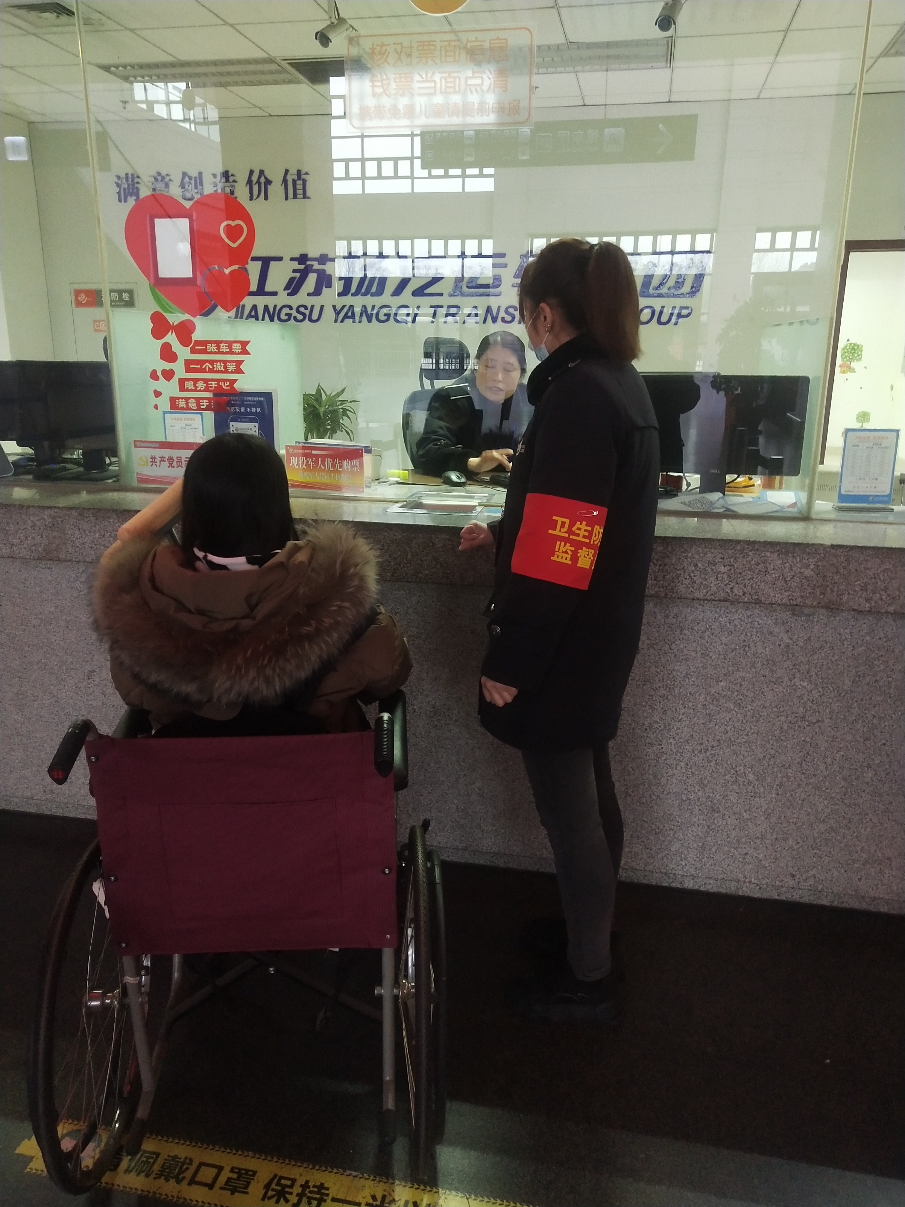 周俊云班長(zhǎng)讓她稍等會(huì),就幫她推來了車站里提供的輪椅,讓她坐在輪椅上面推她去售票窗口買票,還很熱心的一直送到重點(diǎn)旅客無障礙直升電梯里面,然后再送到二樓檢票口,直到幫助這位旅客上了車,臨走前還對(duì)旅客說一句一路順風(fēng)。